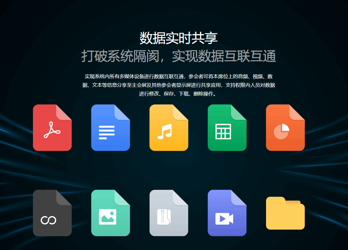 参会者屏幕可与主会屏跟随同步,也可独立显示本地内容,自由切换的显示模式兼顾集体讨论与个人思考。同时,系统实现全多媒体设备数据实时共享,音频、视频、图像、文档、文本等各类信息均可从本席位分享至主会屏及其他参会者显示屏,权限内人员可对共享数据进行修改、保存、下载、删除,打破系统隔阂,真正实现数据互联互通,让参会者之间零距离实时互动,大幅提升会商决策效率。