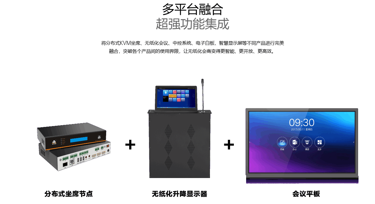 单一设备的功能局限,往往让会议协作陷入 “各自为战” 的困境。讯维分布式无纸化交互系统深谙政企办公需求,实现分布式 KVM 坐席、无纸化会议、中控系统、电子白板、智慧显示屏等多品类产品的完美融合,突破各产品间的使用壁垒,让不同设备无缝协同、数据互通,打造一体化的智能会议生态。