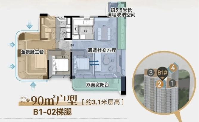 建面90㎡三房两厅两卫户型仅在北地块B1栋有80套在售,是天河主城极为少见的小户型三房产品。该户型使用率高达105%,赠送5.4㎡拓展空间,极大地提升了空间利用率。东南向户型的高层单位可俯瞰金融城天际线,南向户型则直面社区园林,部分高层房源还能远眺广州塔,视野开阔。三开间朝南的设计保证了充足的采光,双卫布局则完美解决了刚需家庭的日常使用痛点。总价820万起的门槛,使其成为主城上车的绝佳选择,让年轻家庭也能在天河安家落户。