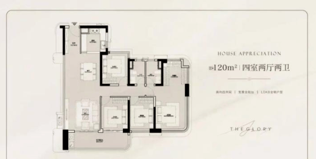 建面120㎡四房两厅两卫是项目的主力户型,深受市场追捧。其使用率高达126%,赠送7.4㎡空间,空间感极强。四开间朝南搭配6米观景阳台,让阳光与风景成为生活的常客。主卧配备270°弧形飘窗,视野无死角,次卧空间均超过9㎡,宽敞舒适,完全可满足二胎家庭的居住需求。该户型在北地块货量充足,高中低楼层均有选择,总价1080万起,性价比极高,是改善型家庭的首选。