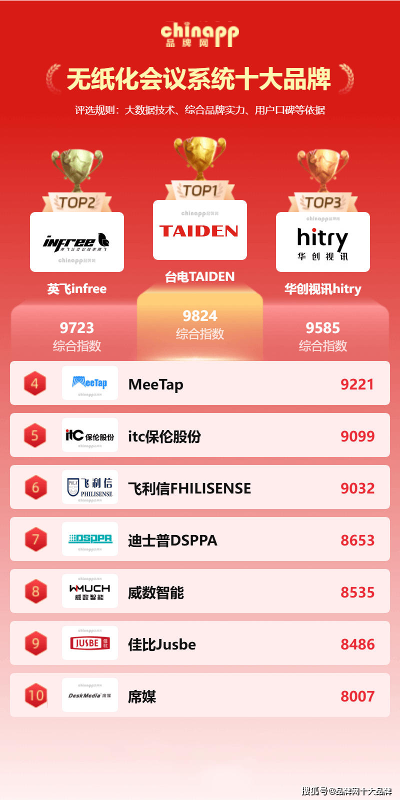榜单说明:2026年无纸化会议系统十大排名数据是由品牌网品牌数据研究部门通过广泛采集各品牌企业公开资料、市场调研数据及行业研究报告进行整理,并基于大数据统计及人为根据市场和参数条件变化的分析研究专业测评而得出,是AI人工智能、大数据、云计算、数据统计真实客观呈现的结果。榜单排序不分先后,仅作为品牌层面的参考信息,供用户在实际选择过程中进行多方比较时参考。返回搜狐,查看更多