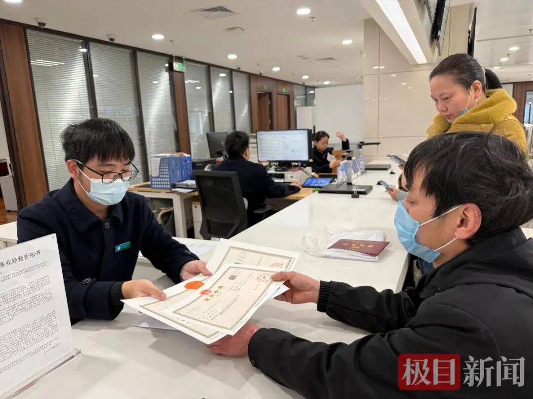 三楼的企业办事窗口同样忙碌。来自安徽的王先生和妻子昨天专程从安庆赶到武汉,就为了在开工第一天顺利办好新的营业执照。夫妻俩在武汉生活了20多年,两年前来到东西湖加盟经营一家早餐店,主要做包子、小吃。今年他们计划开辟线上业务,上线外卖平台,需要办理营业执照变更手续,同时还想办理经营者变更手续。从9点开始办理业务,10点左右,王先生便顺利拿到了新执照。“新年新气象,希望生意红火!”王先生笑着说。他特别提到,全程都有工作人员引导,每一步都有人指引,非常便捷。